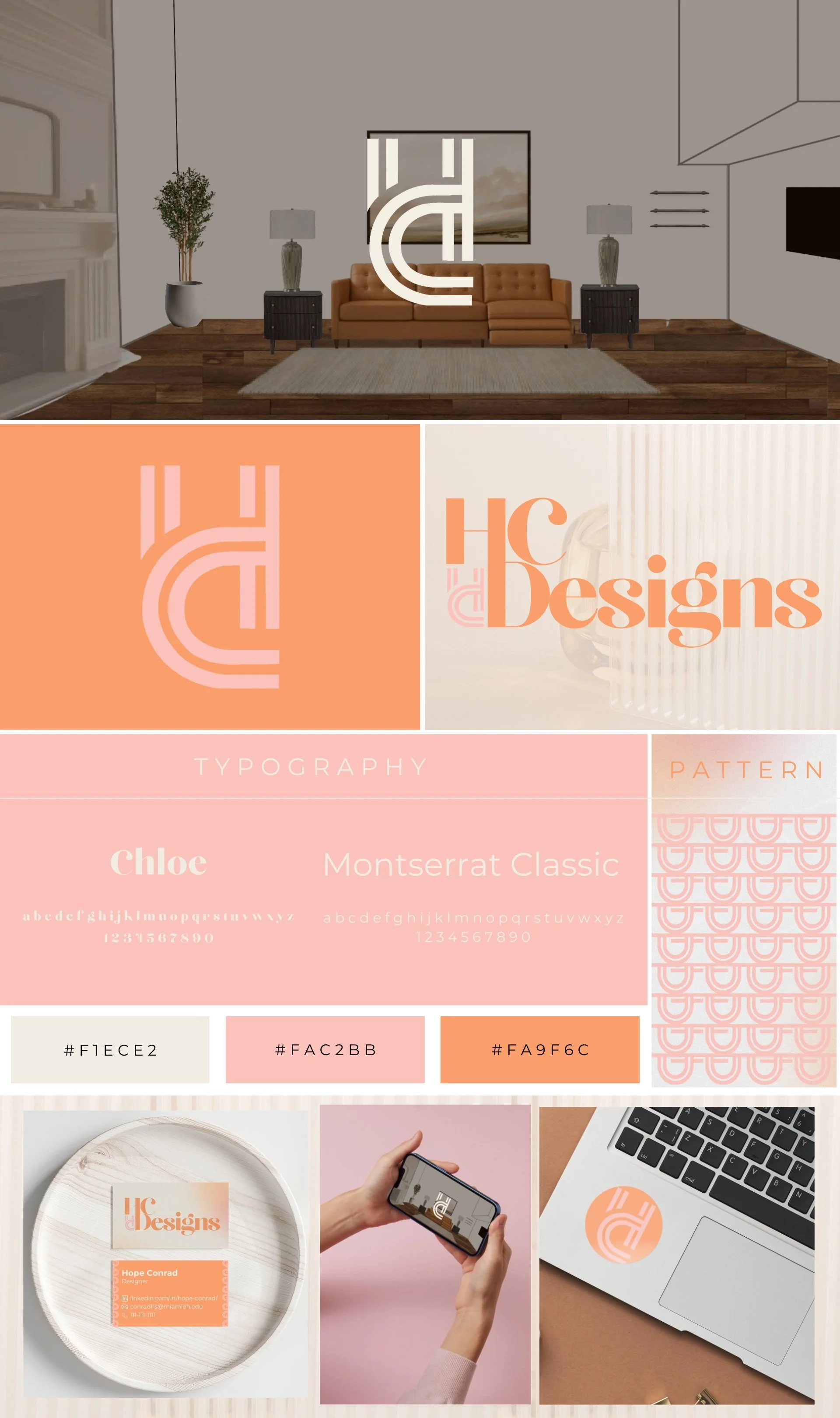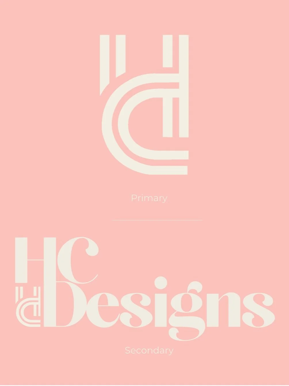 HC Designs’ color scheme consists of soft, warm, and neutral tones, creating a welcoming and refined visual identity. #F1ECE2 (Cream) – A neutral, light beige that conveys sophistication and subtlety. #FAC2BB (Blush Pink) – A delicate, modern pastel pink that adds warmth and softness. #FA9F6C (Peach Orange) – A vibrant yet elegant shade that adds energy and contrast. The colors were specifically chosen to work well across different branding materials without overwhelming the design. Each of the colors can be layered on top of each other in different ways, allowing branding features to be versatile for many applications. Similar to a capsule wardrobe, the thought behind this is that it can be capsule branding, allowing for many pairings.