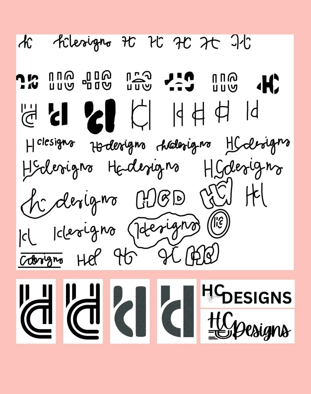 The initial sketches of the brand logo highlight the beginning process of merging the main letters: “h,” “c,” and “d" to create a unique monogram to serve as the brand mark. Through the iterative process, it can be noted that many different versions of the brand mark were explored before choosing the final one.